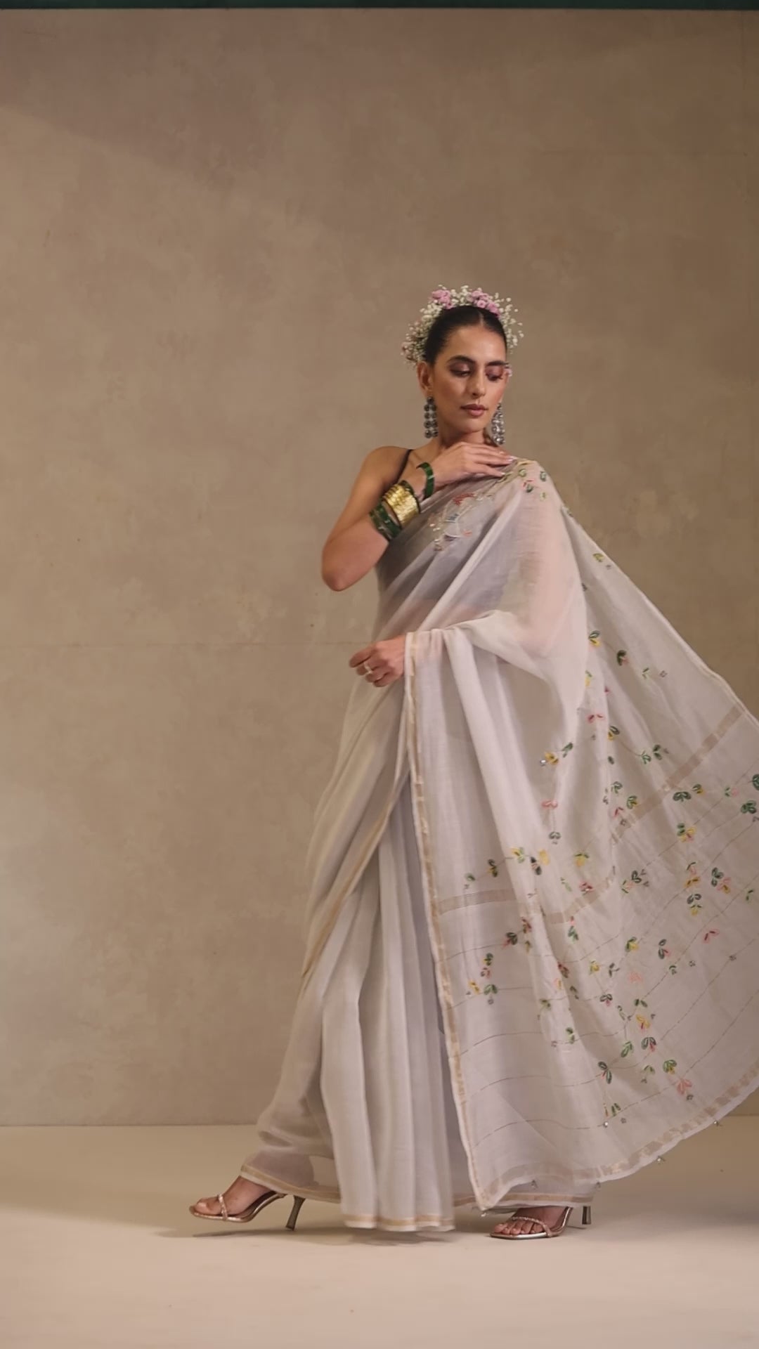 In a soft wash of light grey, this Chanderi cotton-silk saree carries a serene, contemporary charm.